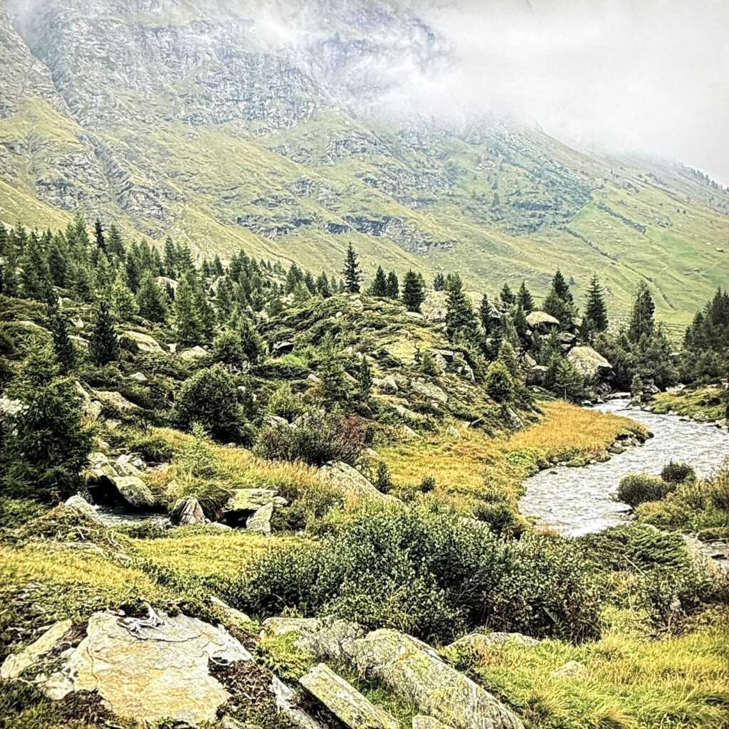 Dieses Bild zeigt die beeindruckende alpine Landschaft Südtirols und eröffnet einen klaren, ungestörten Blick auf die Natur. Ein Bergbach zieht sich, wie ein silberner Faden durch das zerklüftete Gelände. Der Blick folgt ihm von den Felsen im Vordergrund entlang des Wasserlaufs bis in die nebelverhangenen Hänge. Für einen Moment wirkt die Zeit still. Die Szene vermittelt, sowohl Kraft als auch die Ruhe der Natur.