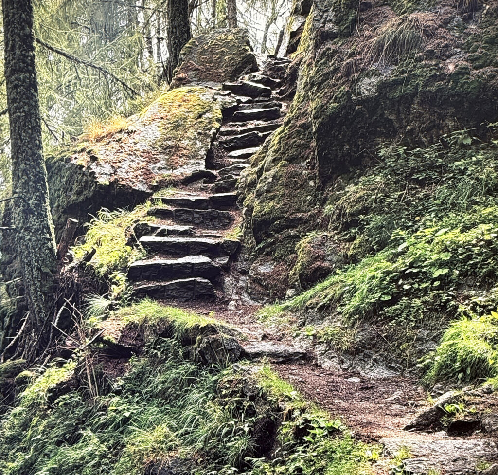 • Felsformationen: Die Treppe wird von massiven, dunklen Felsen eingerahmt. Diese sind über und über mit sattgrünem Moos und kleinen Flechten bewachsen, was auf die hohe Luftfeuchtigkeit und die unberührte Natur in dieser Höhenlage Südtirols hindeutet.