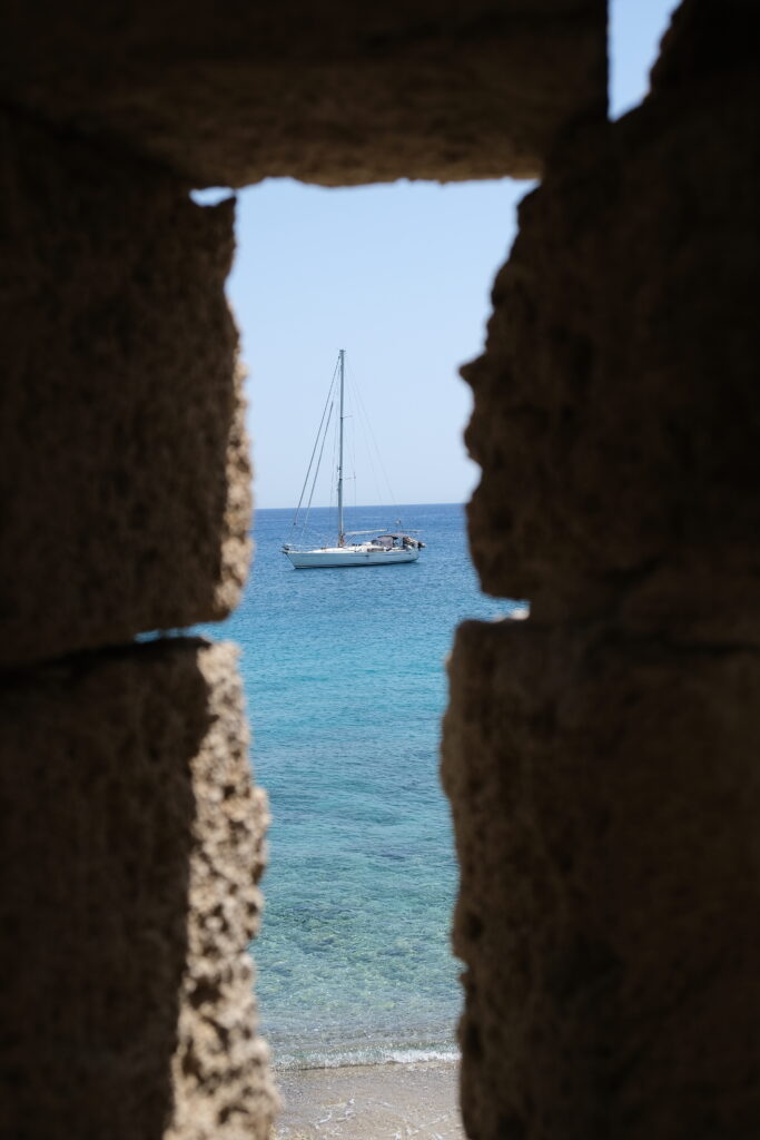 Das Bild ist eine Aufnahme, die die Schönheit des Augenblicks und die Magie der Perspektive auf einzigartige Weise einfängt. Durch eine natürliche Steinöffnung, die wie ein unvollkommener Rahmen wirkt, wird der Blick des Betrachters auf das unendliche Blau des Meeres gelenkt.