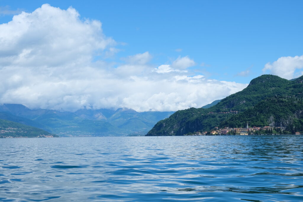 Im Vordergrund erstreckt sich das sanft gewellte Wasser des Comer Sees, dessen Oberfläche in zarten Blautönen schimmert. Die leichten Bewegungen der Wellen verleihen viel Lebendigkeit, während das klare, ruhige Wasser eine einladende Stille vermittelt. Jede Reflexion auf der Wasseroberfläche scheint eine eigene Geschichte zu erzählen und zieht den Blick auf sich.